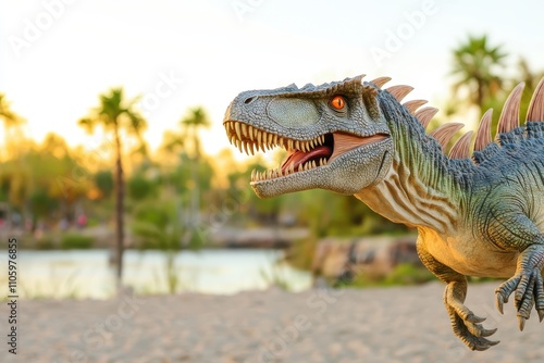 Majestic Allosaurus roams the prehistoric landscape at sunset