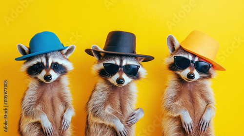 Three playful raccoons wearing colorful hats on a vibrant yellow background