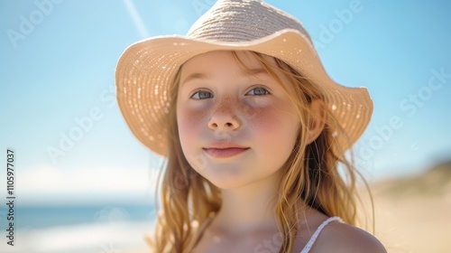 Joyful young girl in a straw hat enjoying the sunny beach day