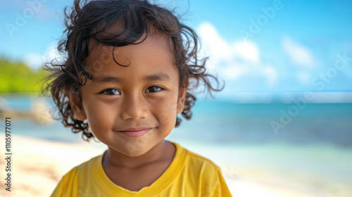 Portrait of a cheerful Micronesian child enjoying nature on a sunny beach