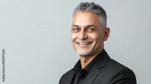 Indian businessman in 40s, black hair, gray suit