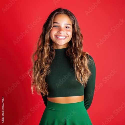 Cheerful teenage girl with wavy caramel hair smiling in green dress