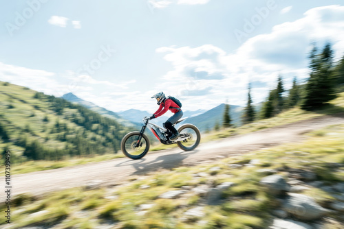 Motorcyclist speeding along a scenic mountain road at high speed