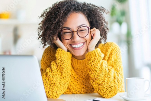 Happy woman in yellow sweater working on laptop at home