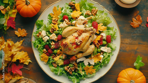 Festive Thanksgiving salad with turkey and autumn leaves on rustic table