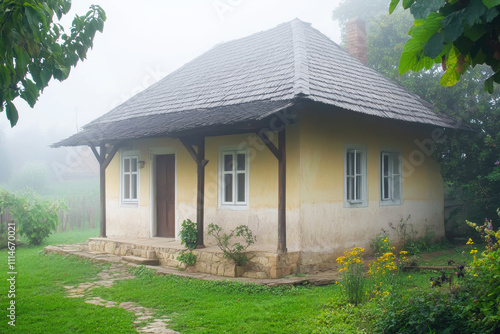 Charming Tudor-style cottage amidst a vibrant flower garden