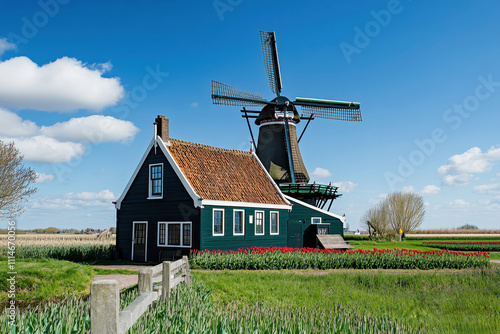 Colorful tulip fields with traditional Dutch windmills under a clear blue sky