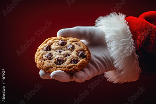 Santa's hand holding a chocolate chip cookie against a festive red background
