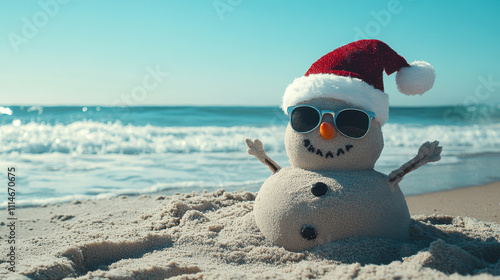 Sand snowman with sunglasses and red hat on a sunny beach day