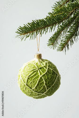 Festive pine cone ornament hanging on pine branch with Christmas theme on white background