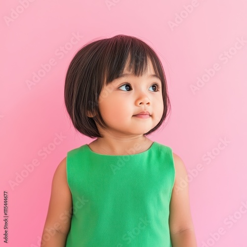 Cheerful Indian toddler with curly brown hair in green outfit smiling happily at the camera