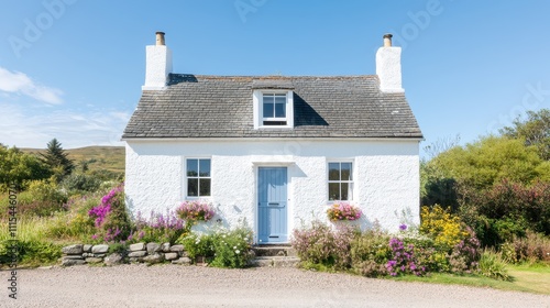 Charming Tudor-style cottage amidst a vibrant flower garden