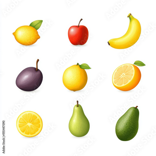 Colorful fruit icon set featuring apple, avocado, banana, and lemon