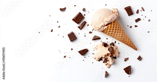 Ice cream cone with chocolate pieces falling in mid-air