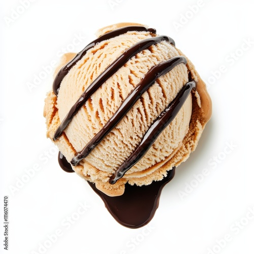 Isolated top view of creamy peanut butter ice cream scoop with rich chocolate drizzle on a white background