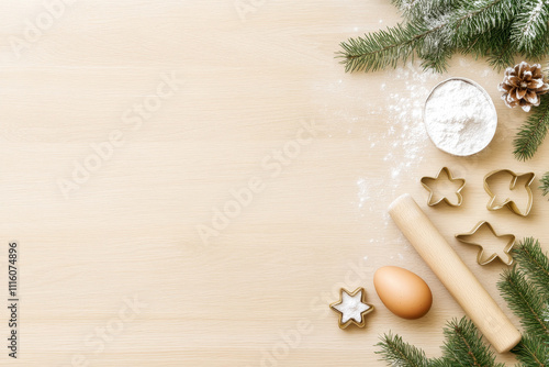 Rustic wooden table with flour, eggs, and holiday cookie cutters