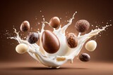 Dynamic splash of milk and chocolate eggs creating an indulgent dessert scene with chocolates