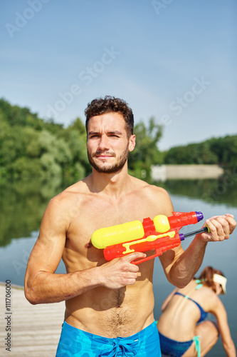 Mann spritzt mit Wasserpistole am See
