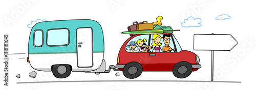 Familie fährt mit Auto und Wohnwagen in Sommerurlaub