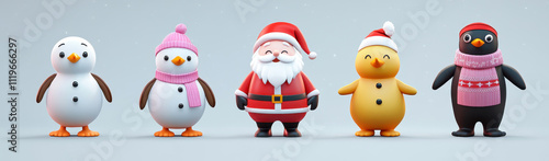 Cute 3D Christmas character set featuring Santa and festive penguins
