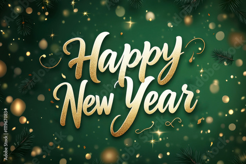 Happy New Year calligraphy on a festive green background with sparkles