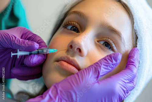 Woman receiving facial aesthetics treatment with precision and care at clinic