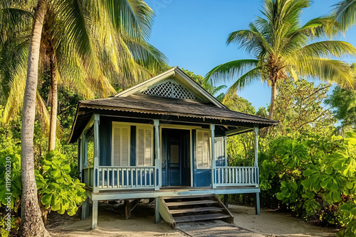 Charming Caribbean beach cottage surrounded by lush palm trees