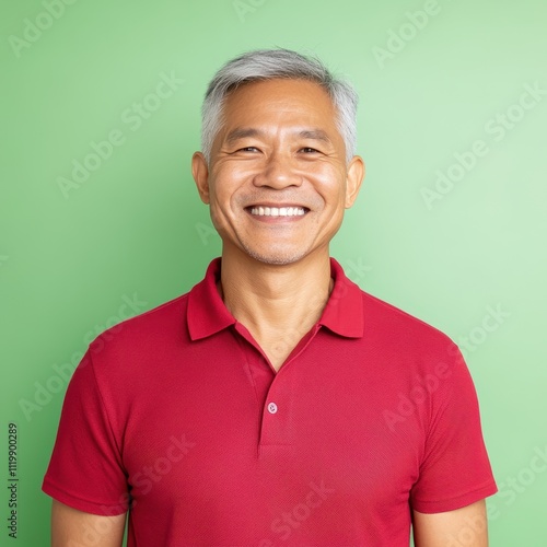 Portrait of a happy Vietnamese man with gray hair wearing red shirt
