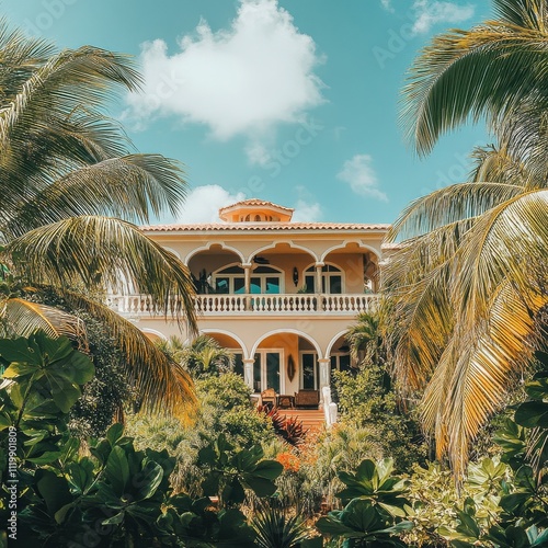Luxurious beach mansion surrounded by tropical gardens under blue skies