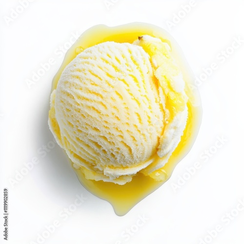 Isolated top view of a single scoop of refreshing lemon sorbet on a white background with vibrant yellow color and smooth texture