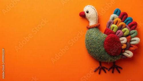 Colorful felt turkey toy on vibrant orange background for thanksgiving