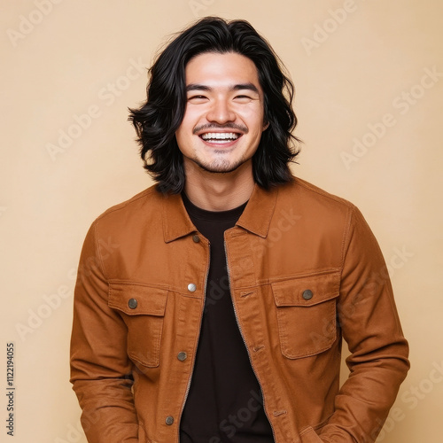 A delighted man in his 20s with shoulder-length black hair wearing a gold jacket against a neutral background, expressing happiness and joy.
