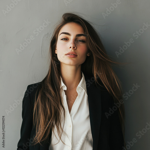 Confident Italian businesswoman in her 30s with long hair, exuding professionalism and poise in a formal setting. Strong and passionate female leader showcasing determination and elegance.