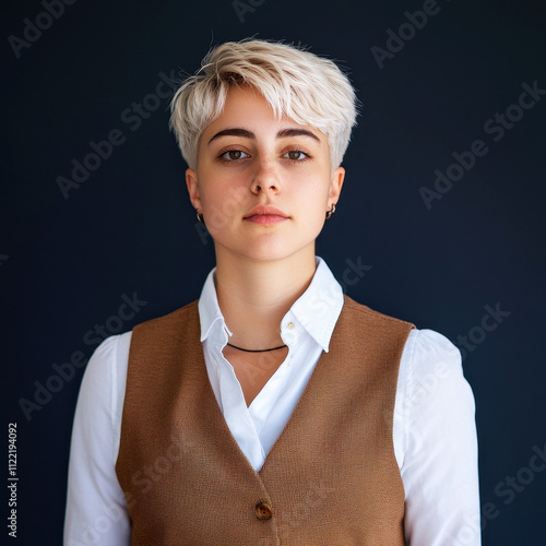 Portrait of a confident young woman with platinum pixie haircut in a white shirt, showcasing elegance and modern style in a professional setting