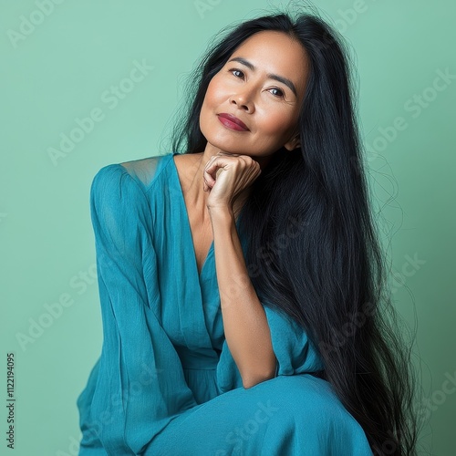 Portrait of a poised Asian woman in her 30s with long black hair wearing a white blazer, looking thoughtful and confident against a neutral background