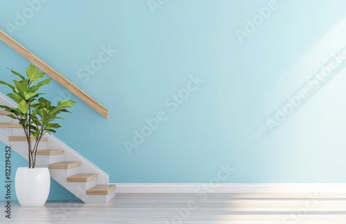 Minimalist interior with a single plant pot and shadow play on a blue wall