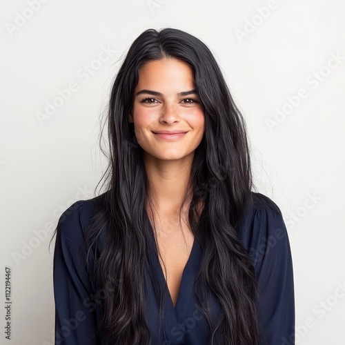 Confident Middle Eastern woman in her 20s with long hair in a professional attire, exuding poise and elegance against a neutral background.