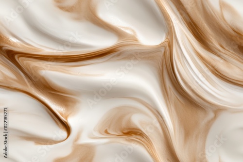 Organic milk and coffee swirls creating a flowing smooth texture with beige and white colors in an abstract pattern.