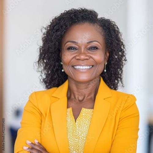 Confident Nigerian businesswoman in a yellow blazer at her workplace