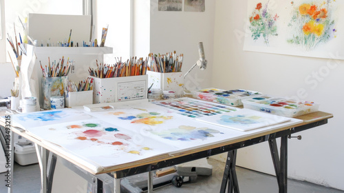 Creative female artist in her 30s painting on a large canvas in a bright studio filled with colorful, abstract art