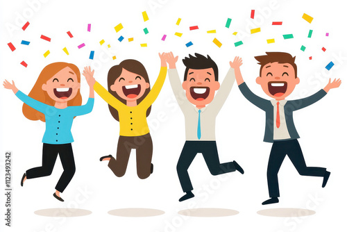 Happy group of four business friends celebrating success together in a cheerful pose at work