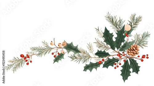 Watercolor Christmas garland with pinecones and holly berries illustration