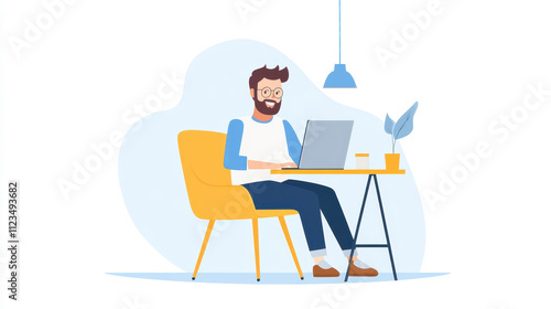 Smiling businesswoman working at a customer service desk. Professional woman using a laptop with speech bubble, plants and modern desk setup