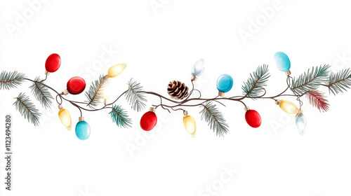 Festive holiday greeting card with colorful Christmas ornaments and winter foliage on a white background for a cheerful celebration