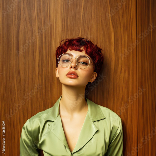 Confident woman with pixie cut and glasses against wood background