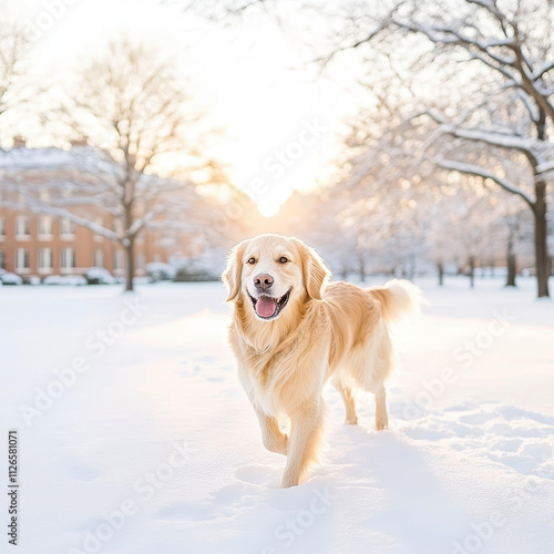 Golden Retriever standing majestically in a snow-covered landscape outside a building
