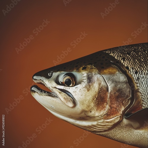 Close-up of a salmon in a professional studio setting featuring detailed scales and texture against an orange background