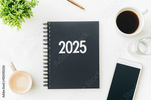 Black notebook with 2025 text surrounded by coffee and pens on desk