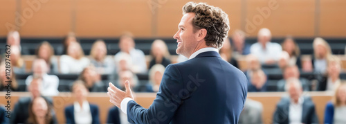 Confident businessman delivers engaging presentation to captivated audience in conference hall