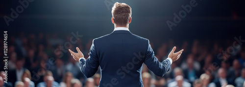 Professional speaker addressing a large audience at a business conference